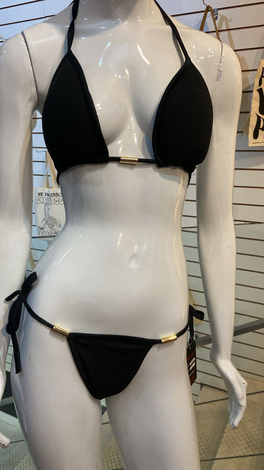 Biquíni Preto Canelado com Detalhes Dourados