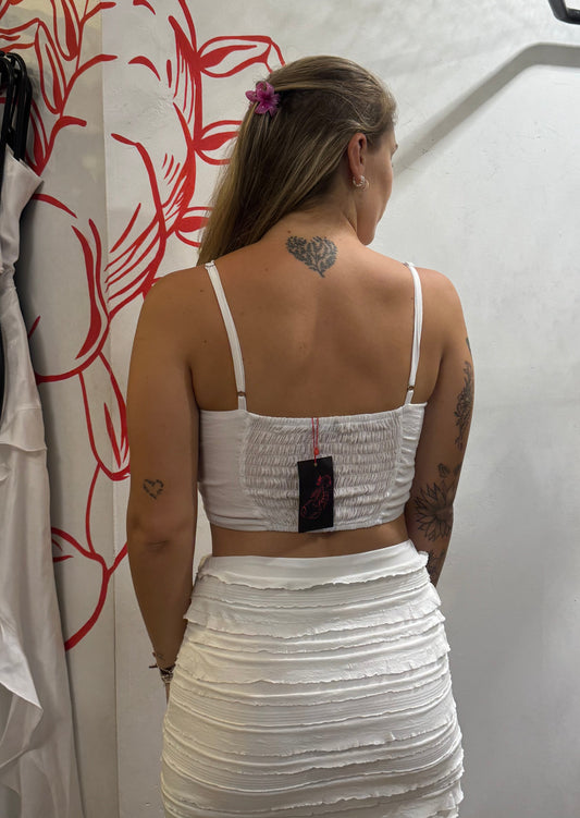 Cropped branco canelado com amarração na cintura