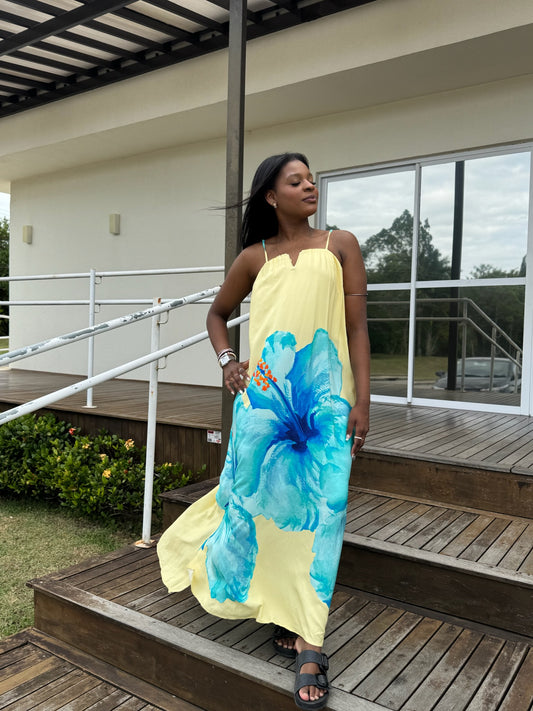 Vestido Amarelo com Estampa Floral Azul