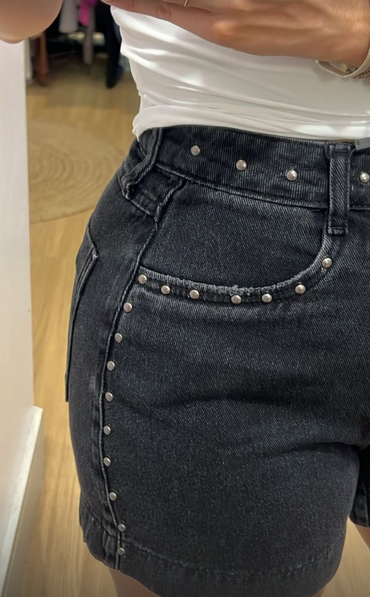 Shorts jeans preto com aplicações em tarraxas