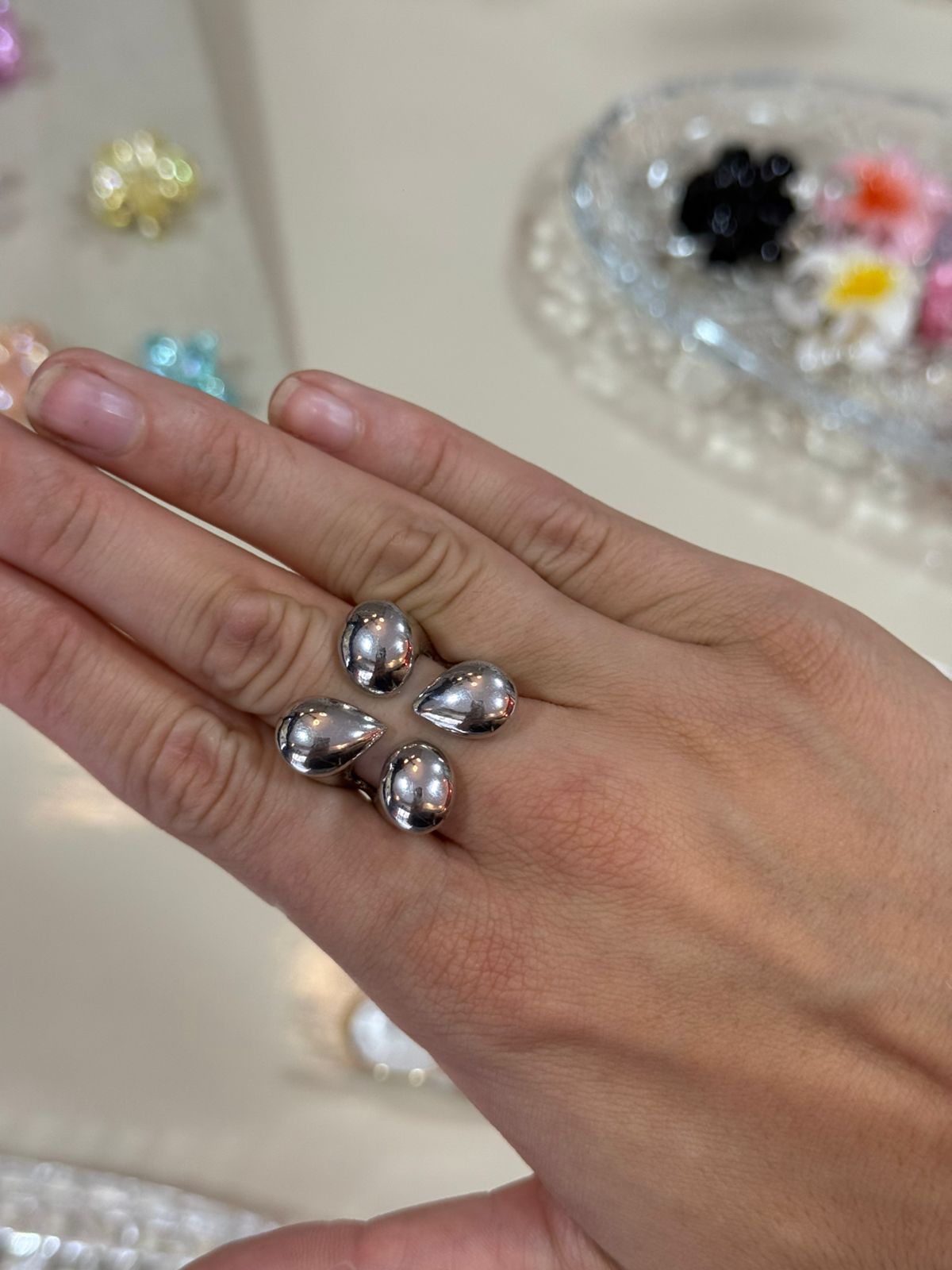 Anel prateado com quatro gotas metálicas em design escultural, criando um visual moderno e marcante.