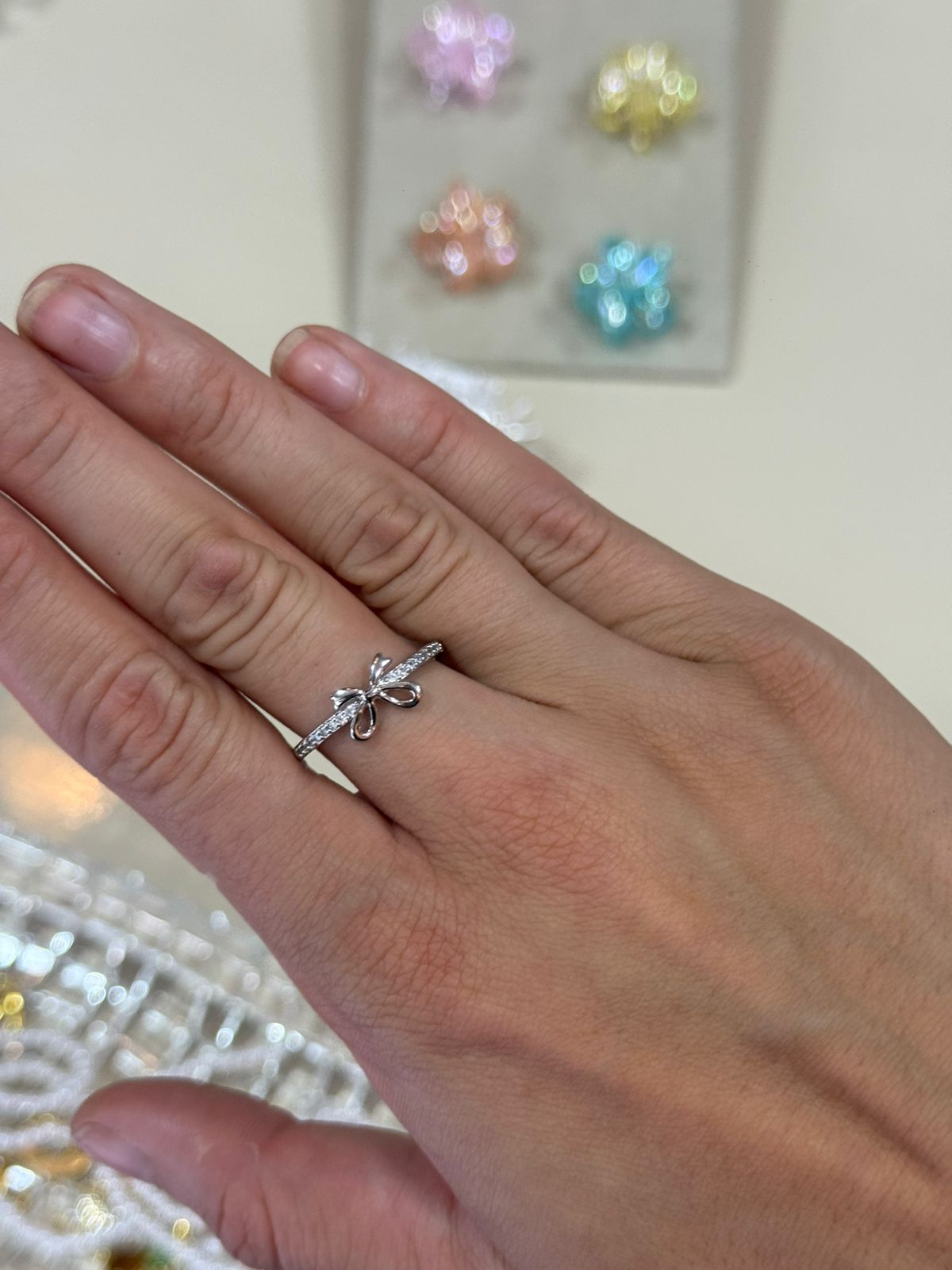 Anel prateado delicado com aro texturizado e detalhe de laço no centro, trazendo um toque feminino e elegante.