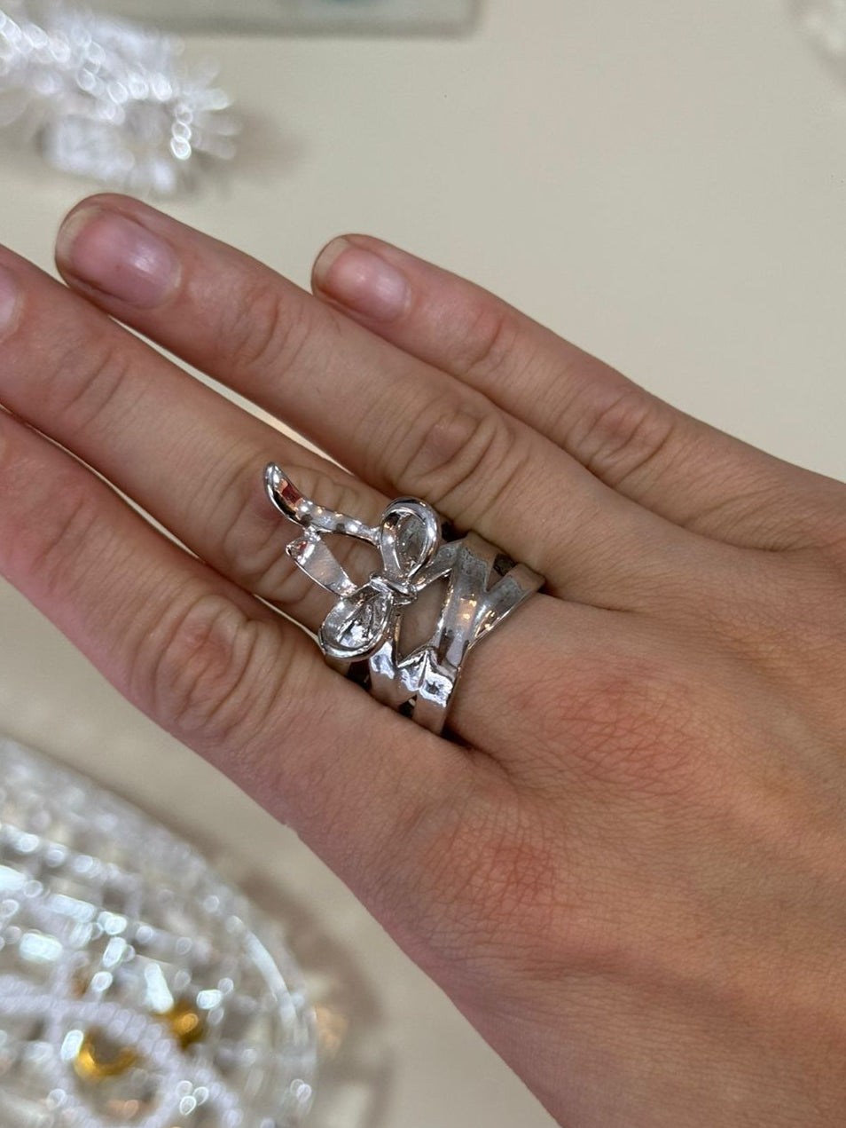 Anel prateado com design moderno formado por três aros unidos e detalhe superior em forma de laço estilizado.