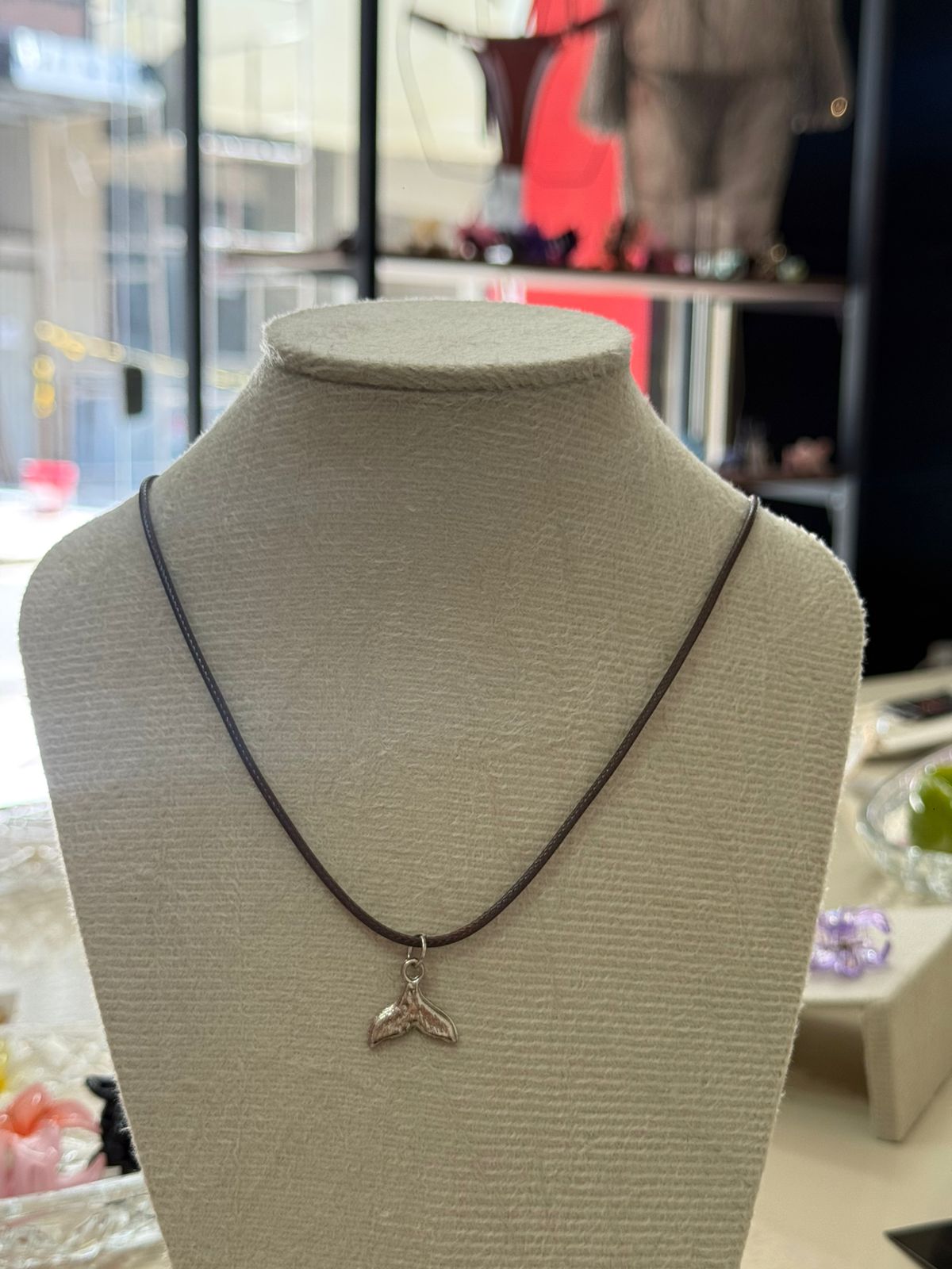 Colar em bijuteria com cordão escuro e pingente de cauda de sereia prateada. Delicado e com vibe praiana, é perfeito para complementar looks leves, veranis e cheios de personalidade. Uma peça simples, charmosa e super versátil.