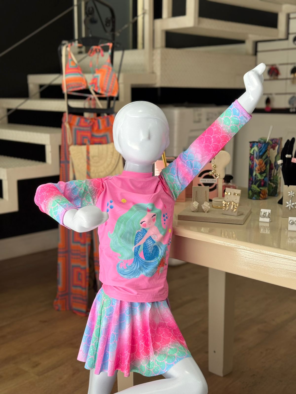 Encantador e cheio de magia, este conjunto infantil traz blusa rosa com estampa de sereia super fofa e mangas longas em estampa de escamas coloridas com brilho delicado. Acompanha saia rodada no mesmo padrão, garantindo movimento e charme. Confortável e perfeito para dias de sol, praia ou piscina, oferecendo estilo e proteção ao mesmo tempo. Ideal para as pequenas que amam o universo sereia.