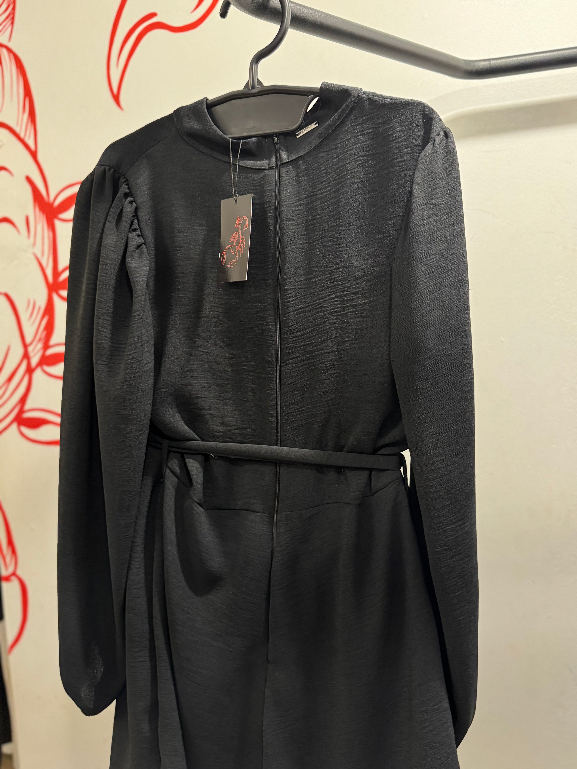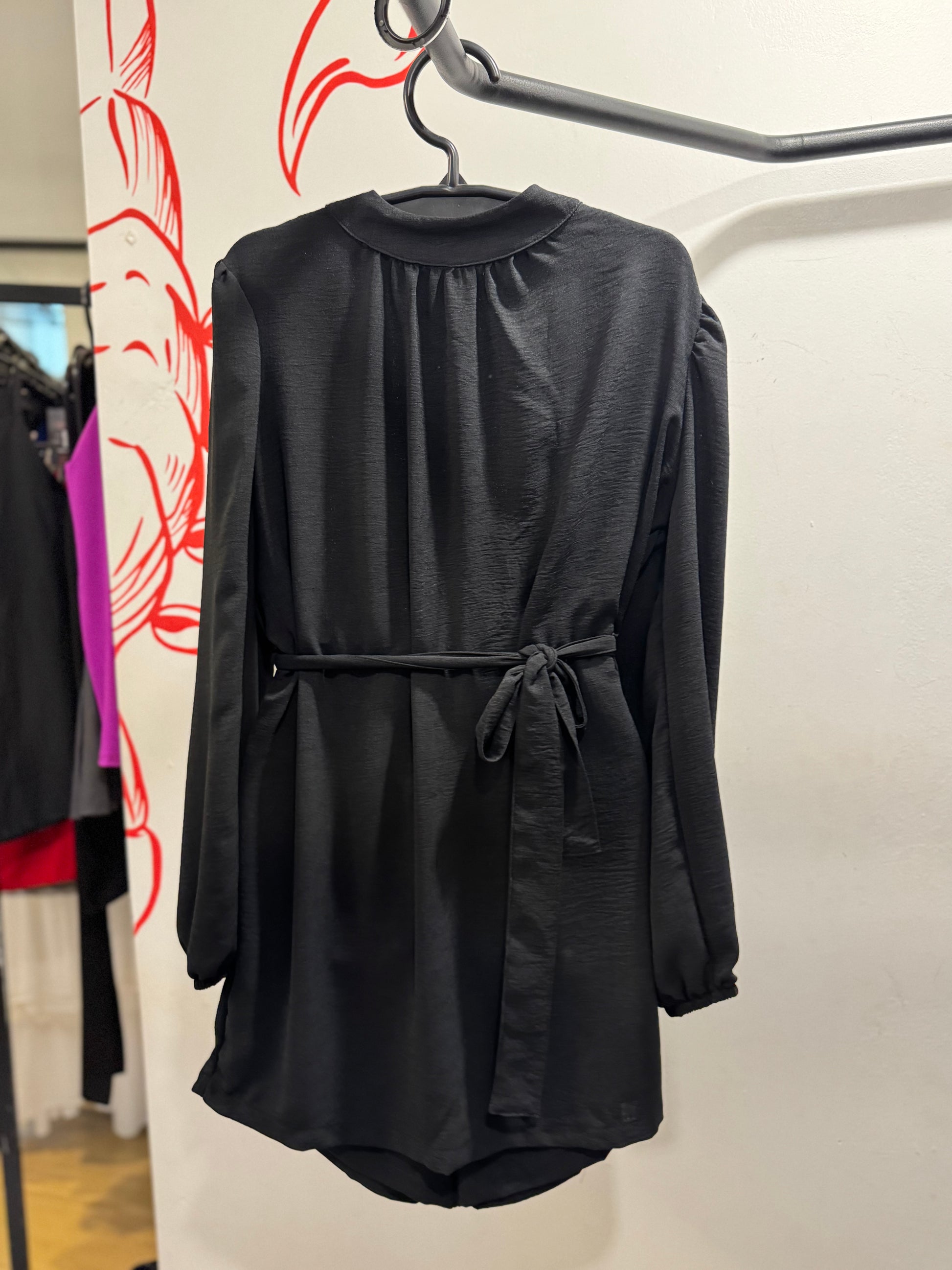 Macaquinho curto preto, modelo soltinho com cinto opcional, fechamento coM zíper na parte de trás.