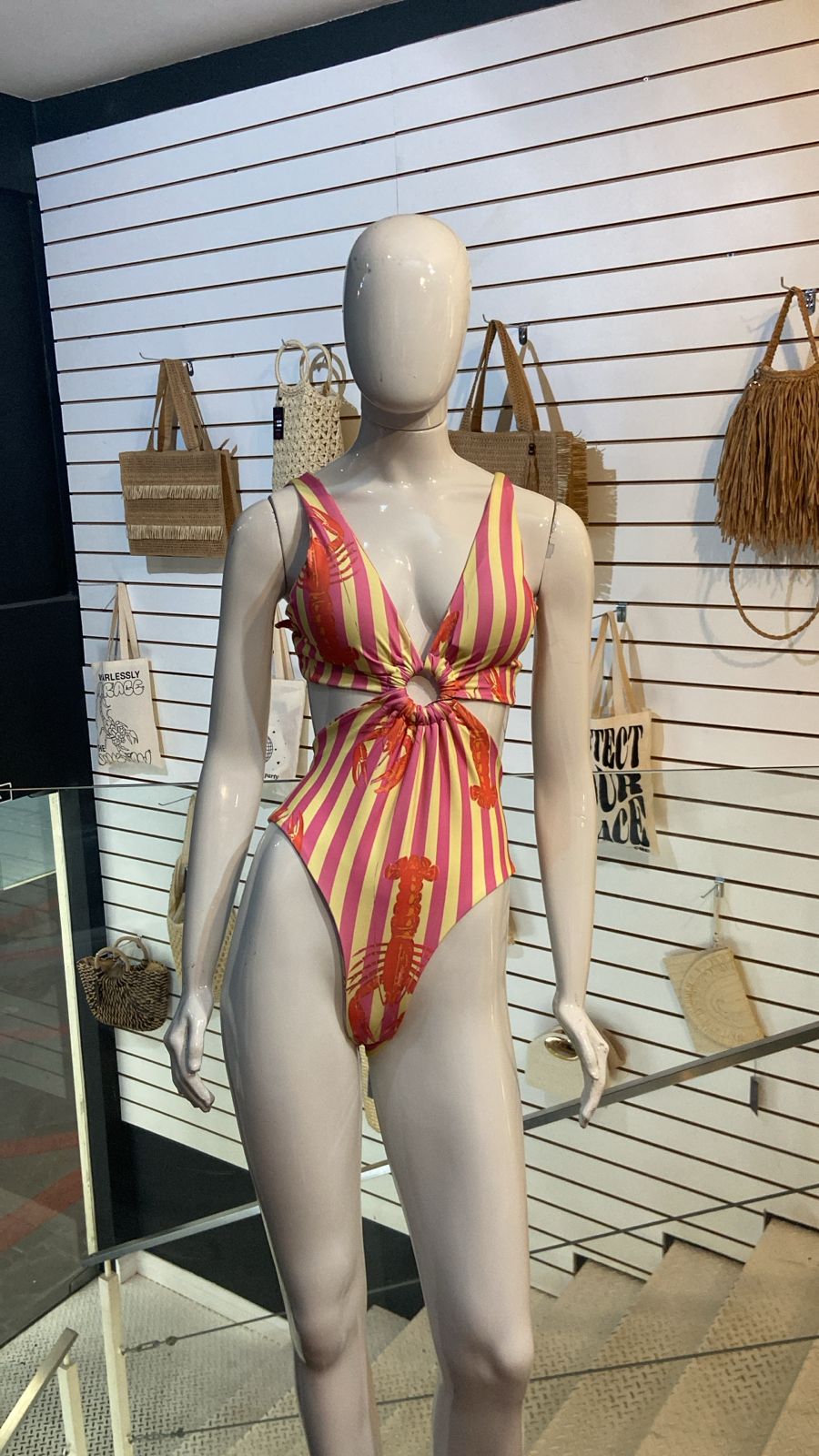 O Maiô Listrado Lagosta é para quem ama um visual divertido, moderno e cheio de personalidade. Com listras em pink e amarelo e estampa de lagostas em tom coral, ele traz aquele mood tropical chique que é a cara do verão.