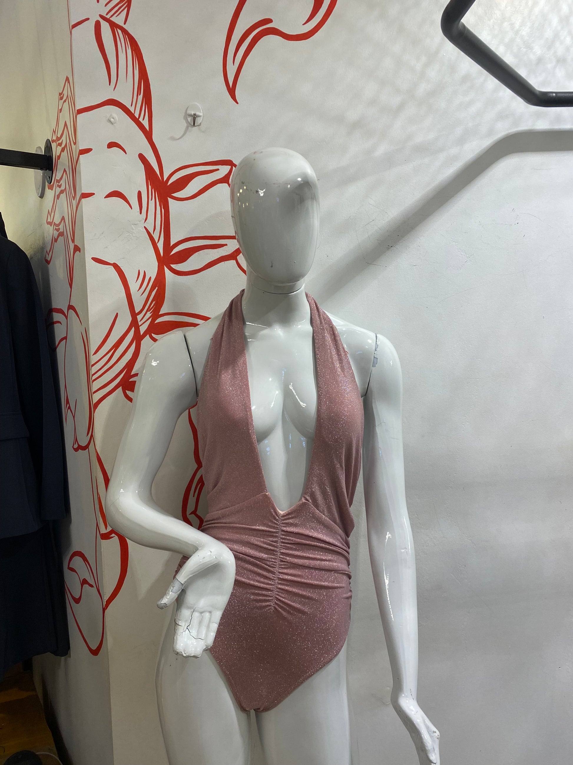 Em tom rosa intenso com leve brilho em lurex, essa peça é puro impacto. O decote profundo em V alonga a silhueta e valoriza o colo, enquanto o detalhe franzido frontal modela o corpo e cria um efeito super elegante e feminino.