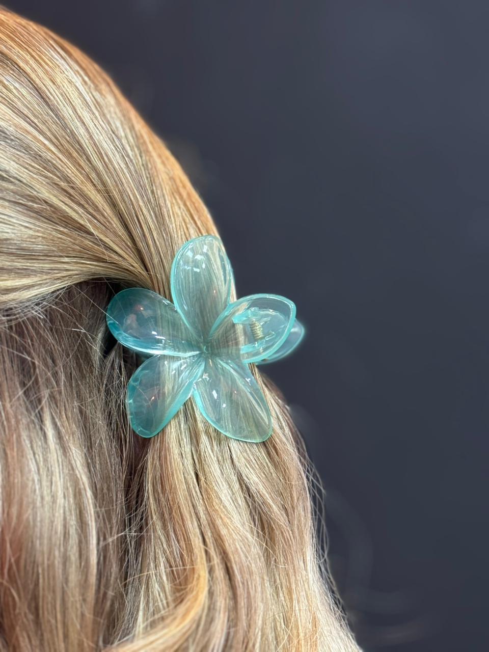 Piranha em formato de flor com acabamento translúcido em tom azul água, trazendo um visual fresh e feminino. As pétalas têm leve brilho e efeito cristal, deixando o penteado moderno e delicado ao mesmo tempo.