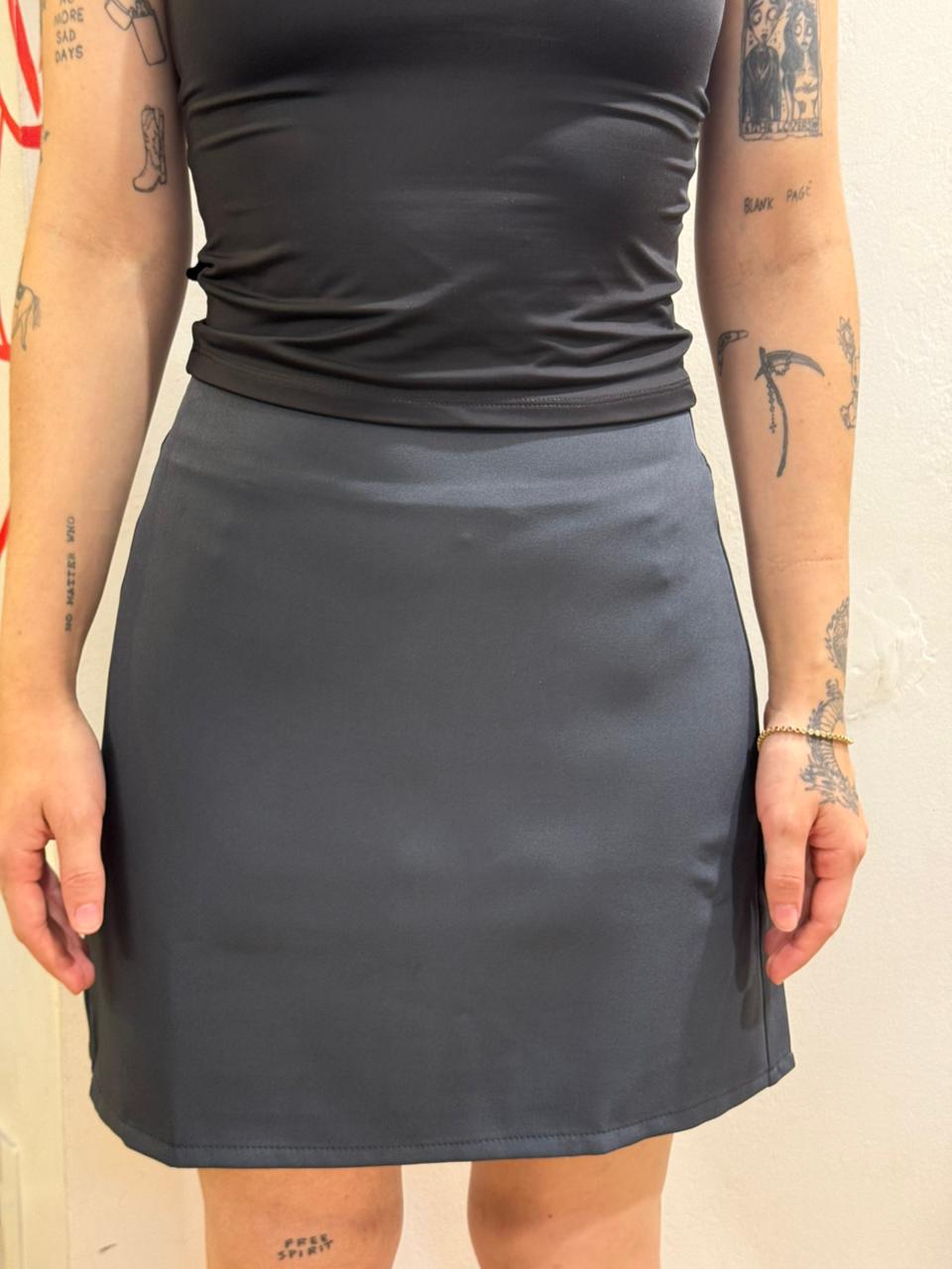 Saia em alfaiataria na cor cinza escuro, com design elegante e acabamento refinado. A modelagem estruturada valoriza a silhueta e garante um visual moderno e sofisticado.